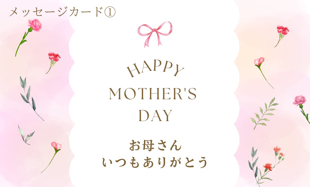 弊社からお母さんへ直接お届けの場合:「①②③いずれかのカード」と「5月10日(母の日)着」で発送させていただきます。